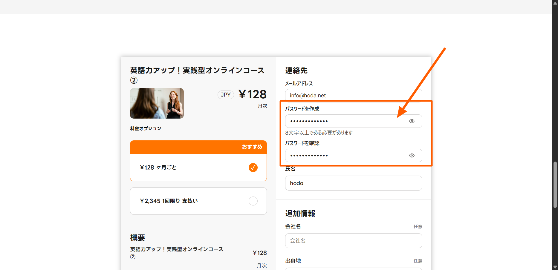 ▼ そして、実際に新規顧客がメールアドレスを入力すると、以下のようにパスワード作成というフィールドが表示されます。これによって、購入後にすぐにライブラリーページに進めるようになります。