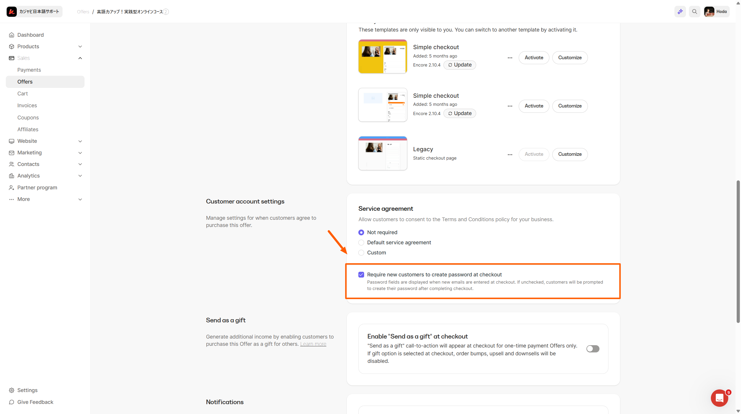 実際に、以下の 「Require new customers to create password at checkout」にチェックを入れることで、Offerから購入する際に顧客は同時にパスワードを新規作成できるようになりました