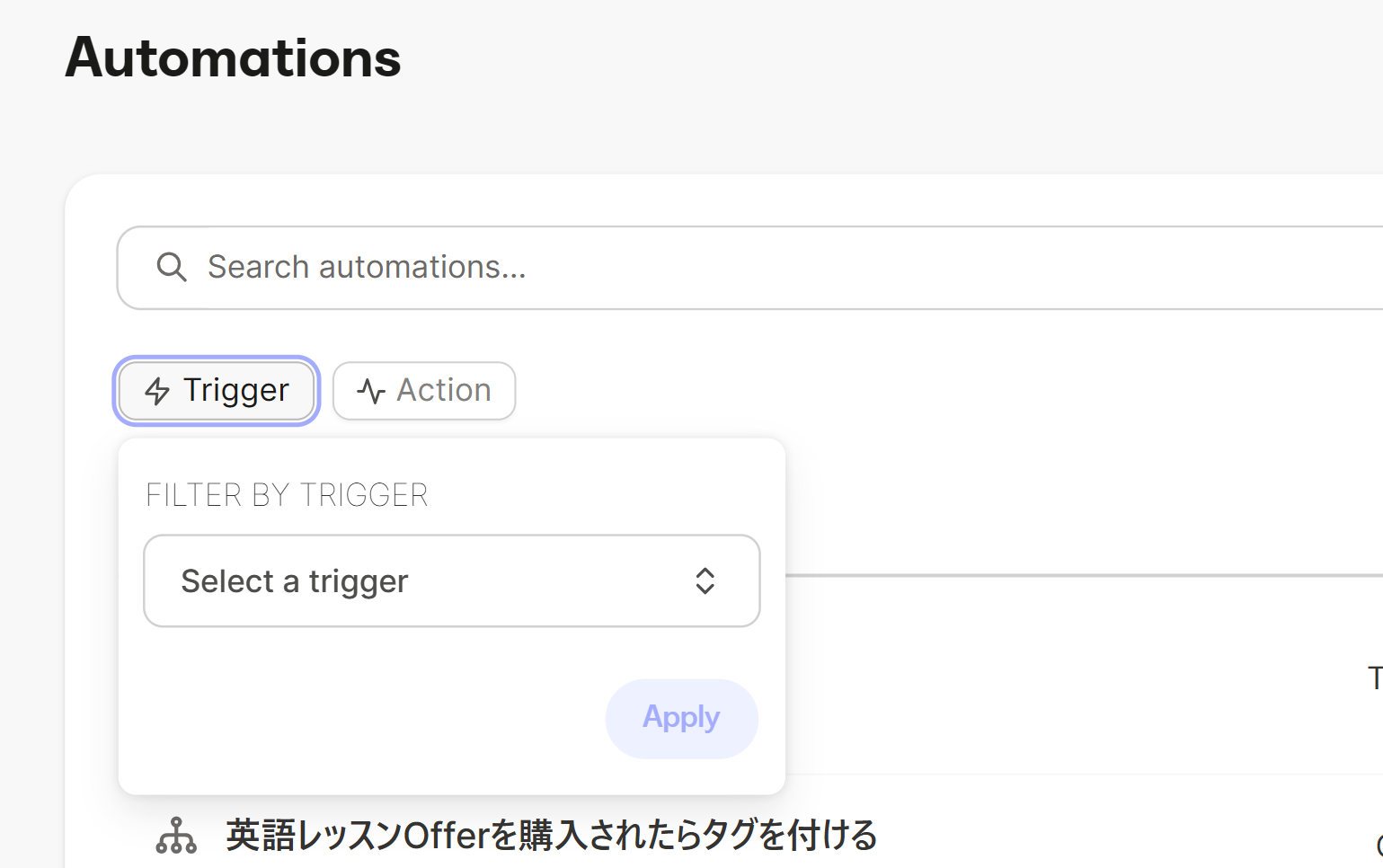 Automations ページに Trigger / Action というボタンが表示され、こちらをクリックすることで、条件を指定してオートメーションを見つけることができるようになりました