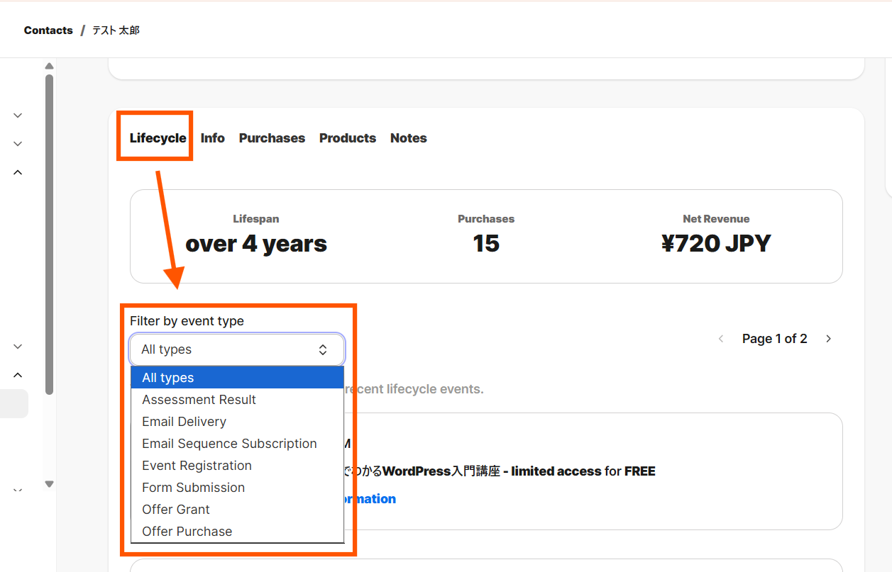 Lifecycleは、Contacts(顧客)ページの各ユーザー詳細画面で確認できる機能で、その顧客がKajabi内でどのような行動をしたのかを時系列で確認することができます。例えば、メールを受信した履歴やフォーム送信、商品購入など、マーケティングやサポートに役立つ重要なアクションがここに記録されます。