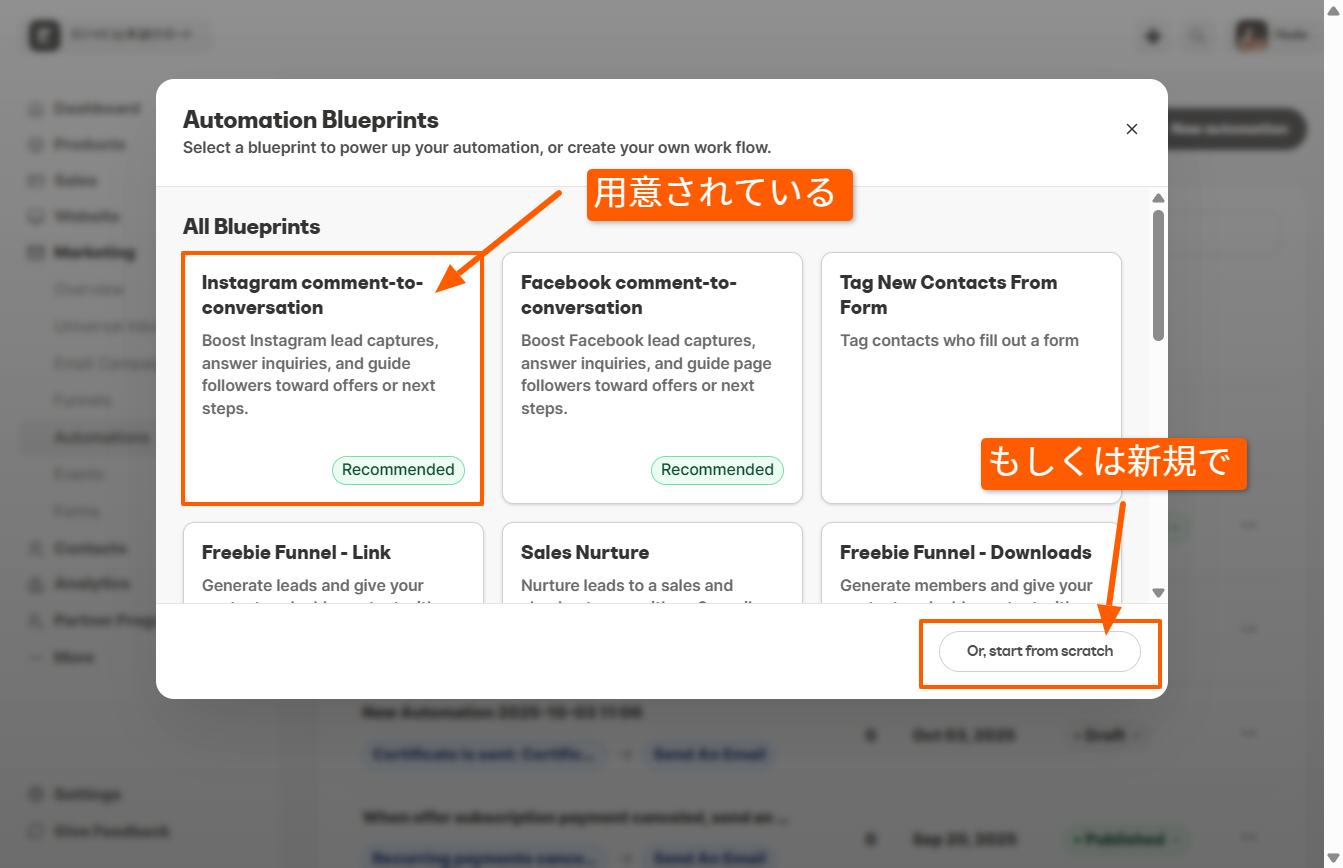 次に コメントからの DMの自動化をするにはオートメーションを設定します。 まずは新規でオートメーションを作成します