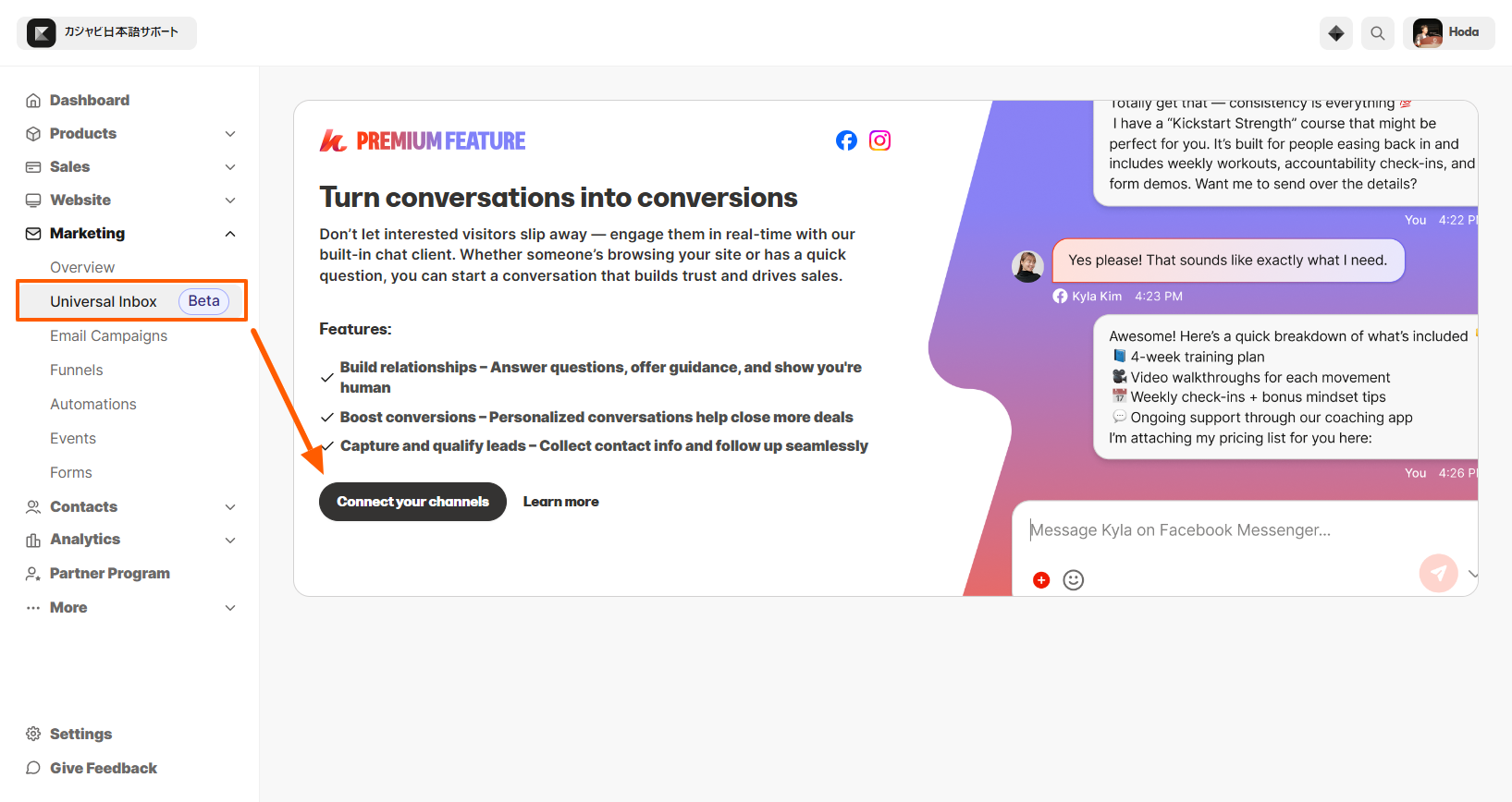 まず Marketing > Universal Inbox に進みます。 Connect your channels ボタンをクリックします。