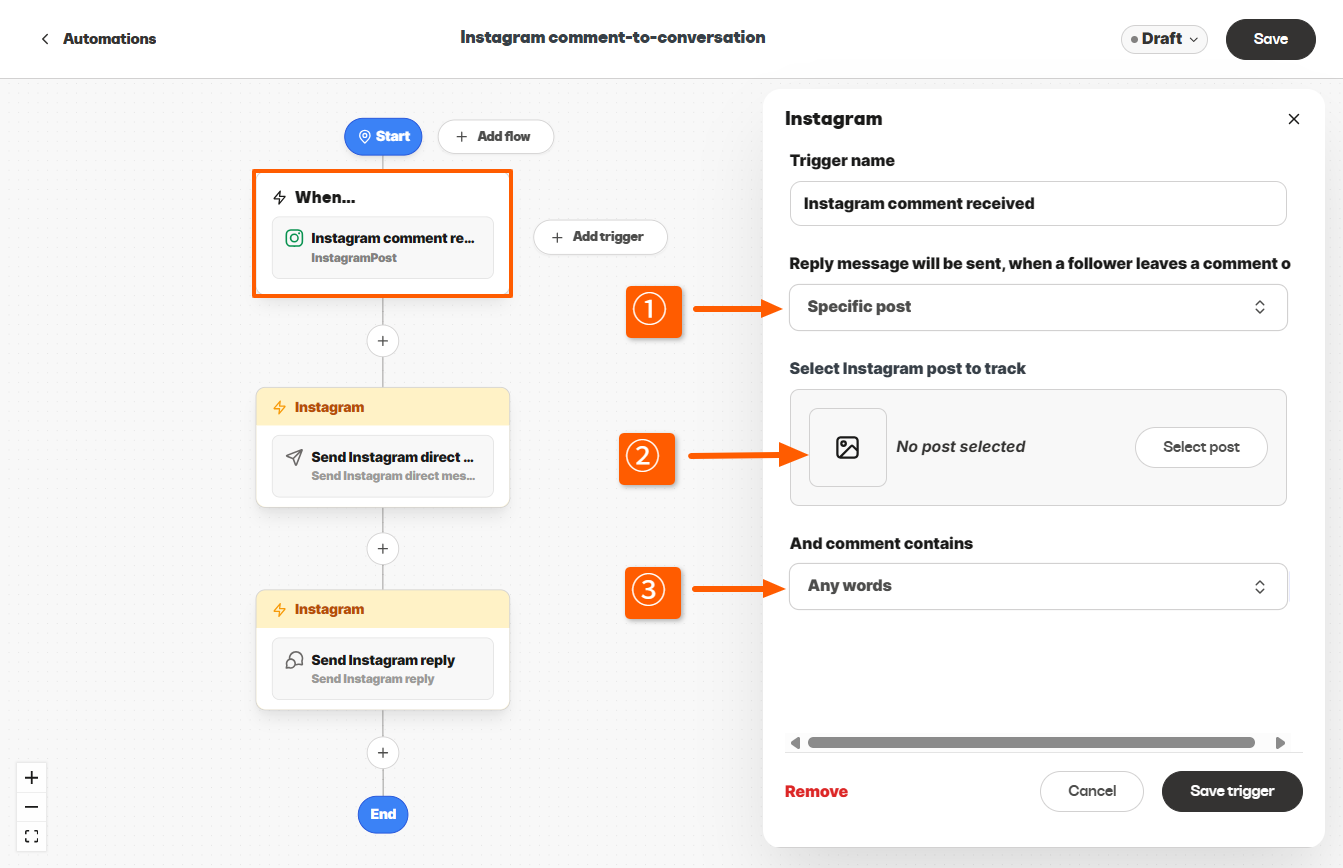Send Instagram Reply のオートメーションを使うと、コメントからの返信を自動化することができます。これはコメント自体に返信するためのオートメーションです。