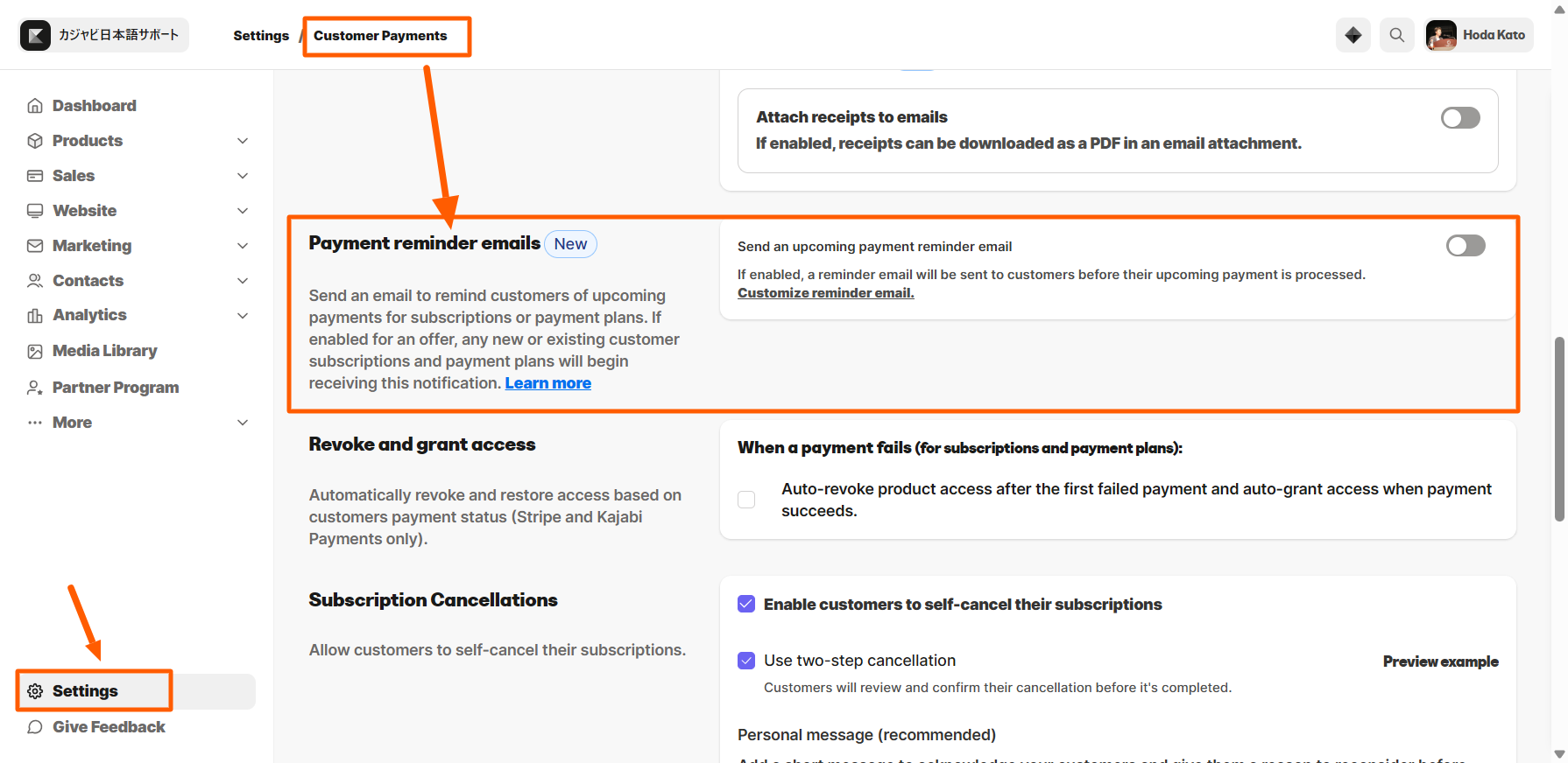 まずは Settings > Customer Payments > Payment reminder emails に進みます。こちらをONにすることで、このメールを有効にできます